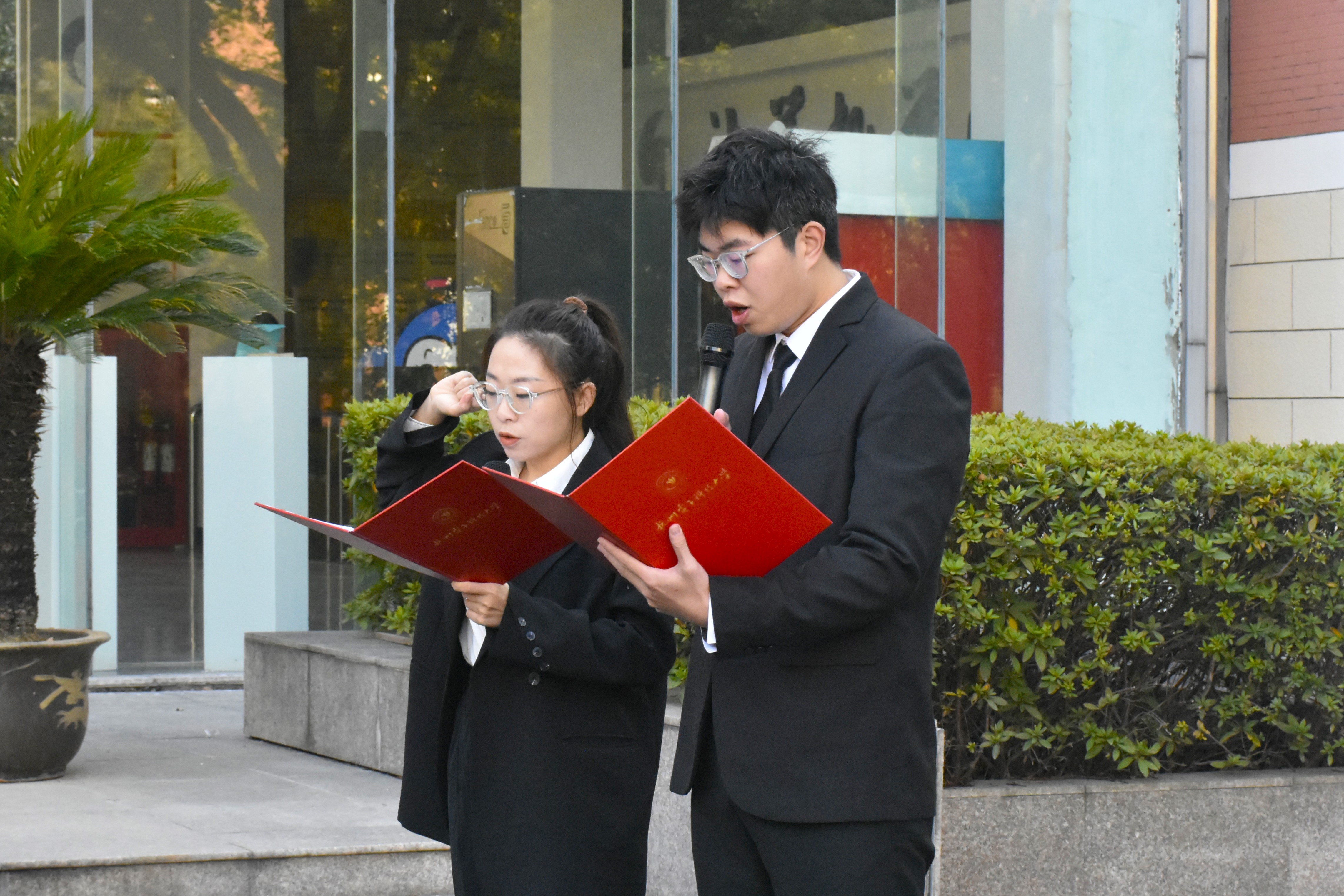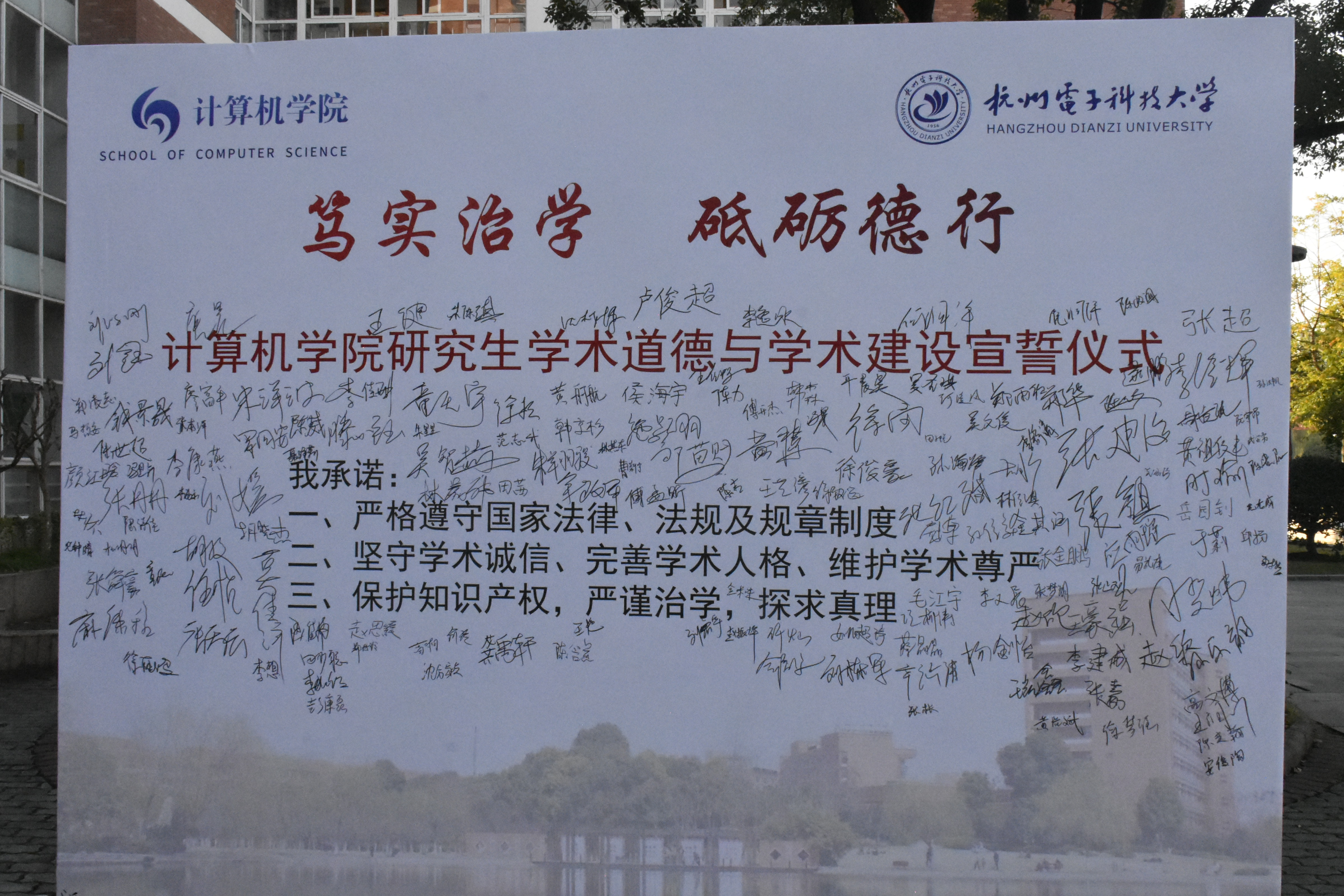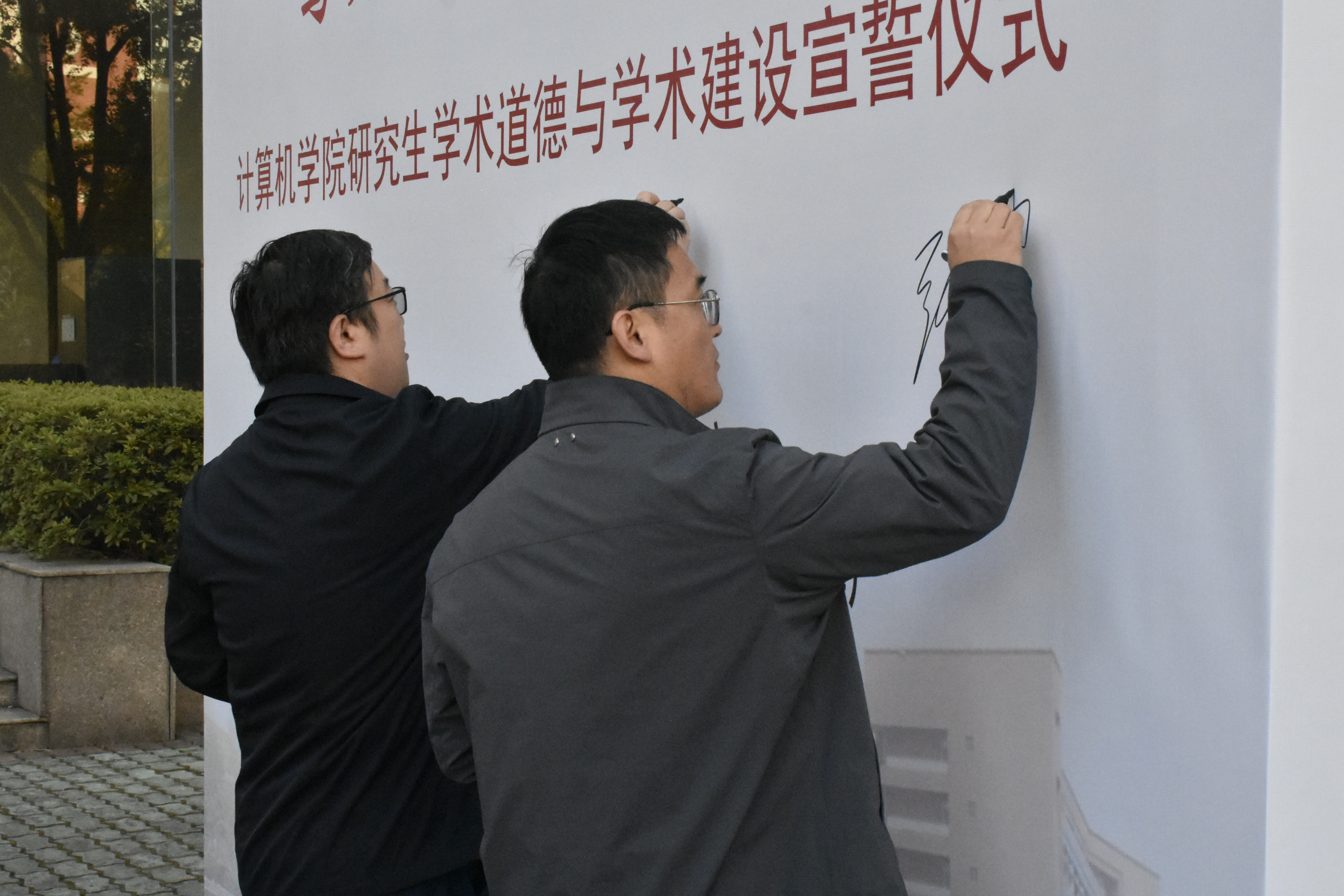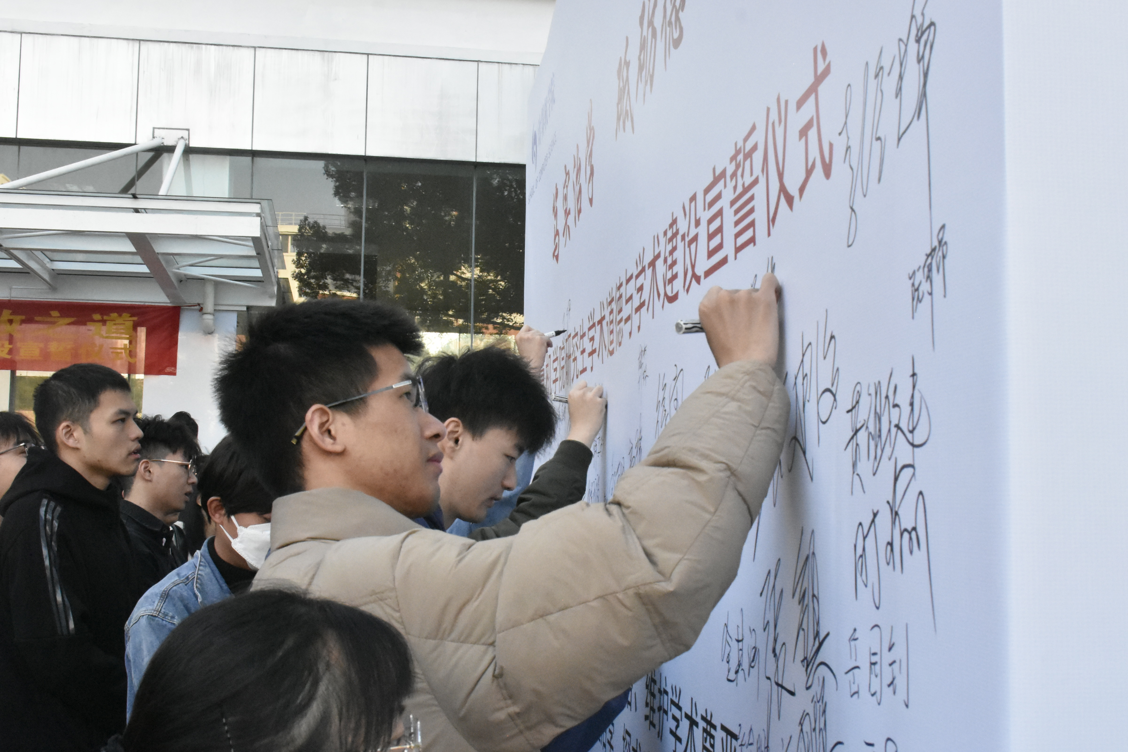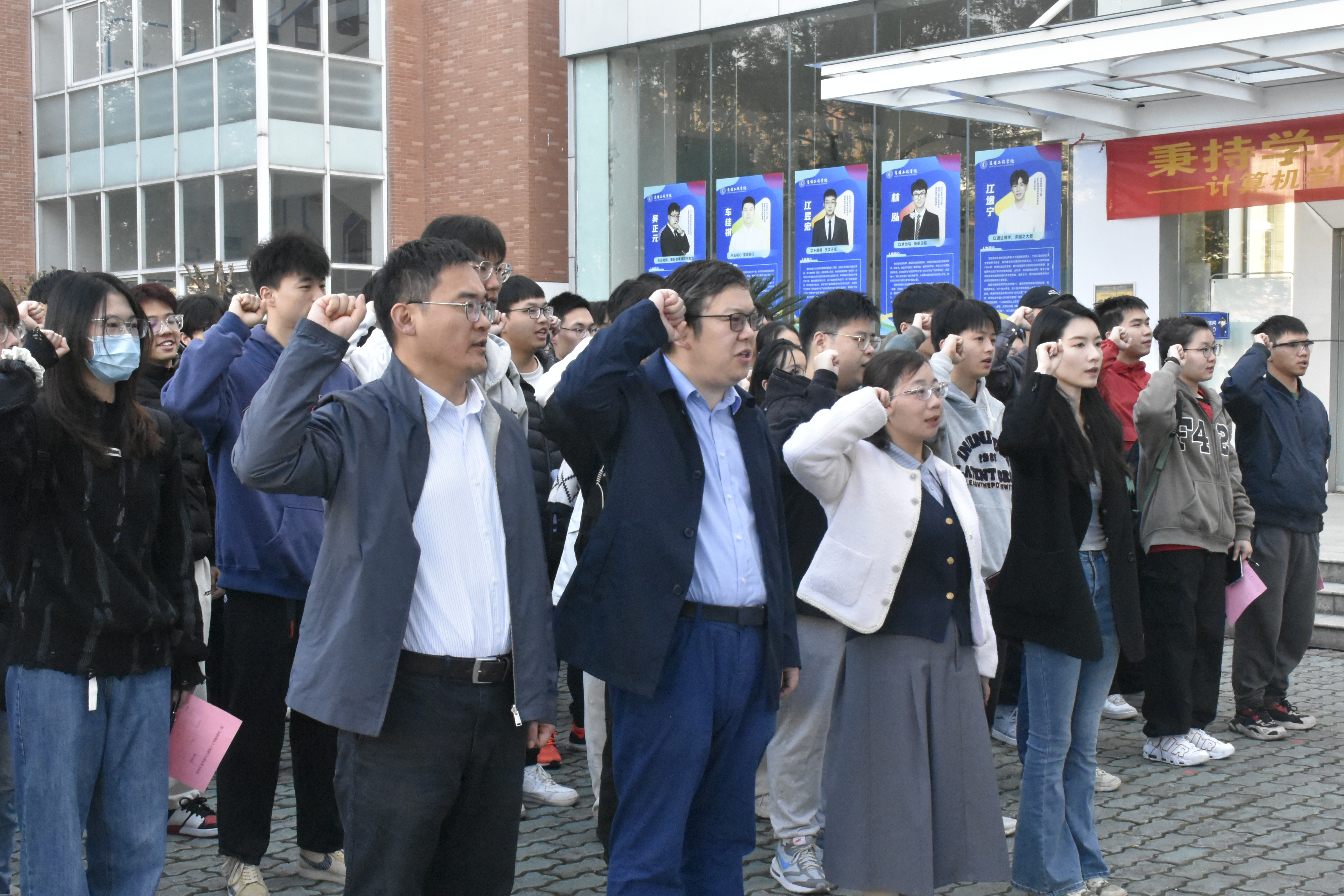 在计算机学院副院长徐岗、副院长张建海的带领下,师生共同在学院大厅门口的展板前宣读誓词、签名并在展板前拍照留念。老师和同学们踊跃参与,热情高涨,组织人员引导大家按照顺序排队等待,宣誓仪式紧张而又有序地进行着。虽然天气有些寒冷,同学们饱满的状态仍充分展现了学院学生们对于本次活动的重视。
