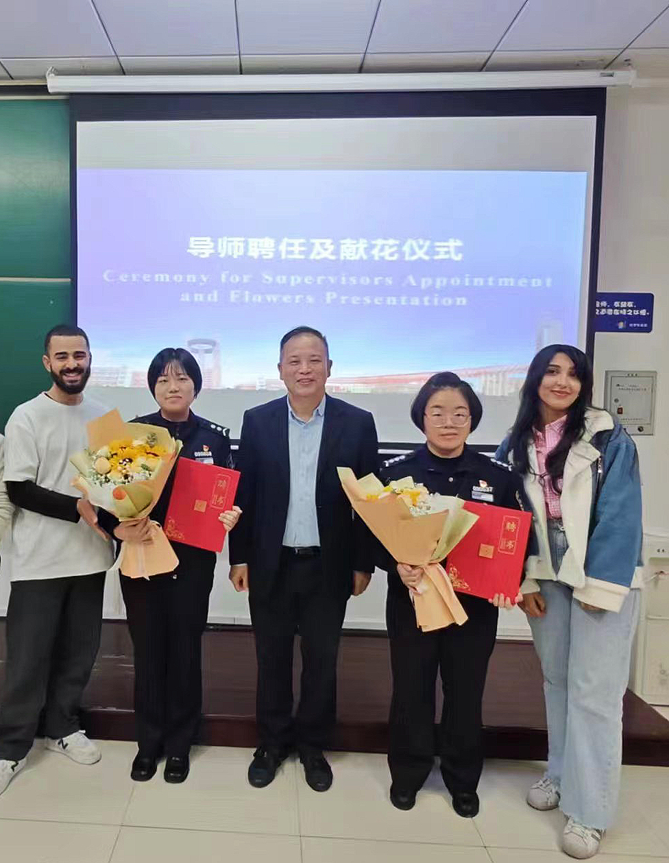 副院长费沉涵致欢迎辞,她对两位警官的到来表示热烈欢迎,并简要介绍了本次活动的基本情况,阐述了普法宣传对于留学生教育的重要意义。副校长杨勇代表学校对钱塘公安分局出入境管理大队长期以来对我校外事工作的专业指导和热情服务表达了感谢,并代表学院聘请民警陈雨琦、余虹担任我校留学生法制教育校外导师。随后,留学生代表向两位警官献上鲜花,对其周到细致的服务表达感谢。