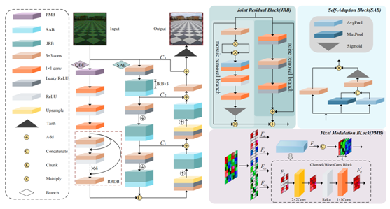 该项研究由杭州电子科技大学、杭州电子科技大学丽水研究院合作完成。该论文的第一作者为2021级硕士研究生李浩然,指导老师为郑博仑副教授和颜成钢教授。图像去马赛克是图像信号处理(ISP)中的一项基本任务,其目的是根据特定的颜色滤波阵列(CFA)模式重建RGB图像。然而,智能手机摄像头的传感器尺寸有限,无法实现高质量成像。于是转向使用Quad Bayer CFA的像素装仓,以在较小的传感器尺寸中捕获更真实的场景信息。这种滤波器阵列的优点是通过合并相邻的像素并允许将相同颜色的像素组合成更大的像素块来提高图像传感器的性能。然而,由于相同颜色像素之间的距离增加,从Quad Bayer CFA重建全像素RGB图像难度增加。针对这个问题,本研究提出了一种具有联合残差学习的双编码器网络,从Quad Bayer CFA捕获的RAW图像重建视觉上满意的RGB图像。具体来说,利用了双编码器来彻底提取信息,其中包括自适应编码器和四拜耳编码器,从而解决了从Quad Bayer CFA中提取信息的困难。在自适应编码器中,我们首先将联合去马赛克和去噪过程解耦为两个独立的分支,并将它们包含在一个联合残差块中。然后引入自适应块来弥补输入RAW图像和重构RGB图像之间的域差异。在四拜耳编码器中,我们设计了一个特殊的四拜耳特征提取块,称为像素调制块,以充分利用Quad Bayer CFA在噪声抑制和颜色恢复方面的优势。