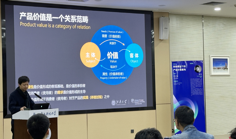 研讨会上,曹鸣教授从产品价值范畴、多元特征、价值创造的综合视角、产品价值创造新驱动、产品体验的逻辑规范和品牌指引等多个维度出发,结合江南大学扎实、丰富的产学研融合的具体教学实践案例,深入浅出地介绍和剖析了当代体验设计与产品价值重构之间的关系,数字技术、工具和手段、人和物、人性的关系。学术研讨活动也使与会师生对设计赋能产业、推动国货品牌崛起、服务人民美好生活的设计使命有了更深刻的理解和认识,与会师生与专家积极互动,现场气氛热烈。