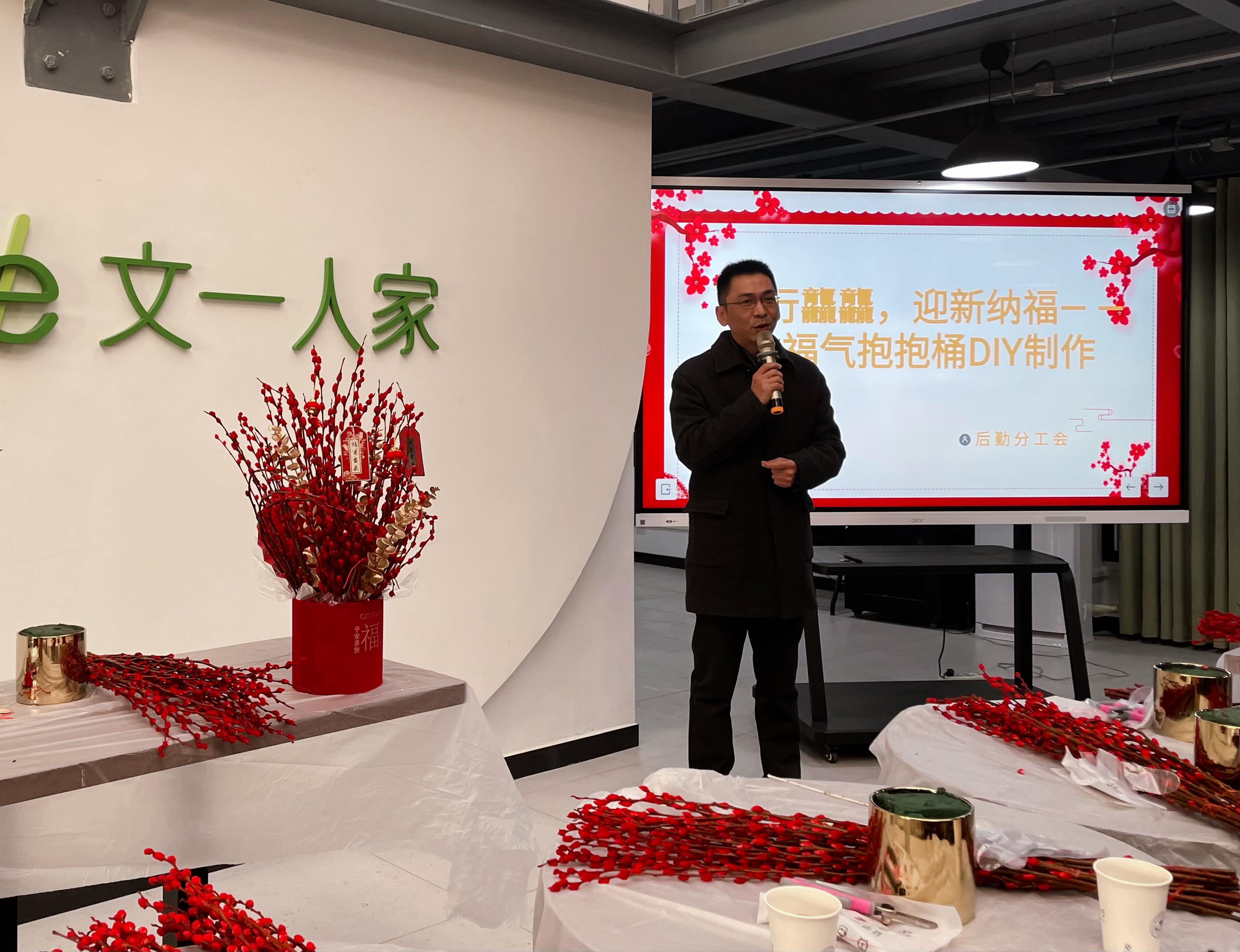 在年宵花DIY制作活动中,全体老师在插花指导老师的讲解指导下边学边做,经过半小时的亲手实践,一桶桶红红火火、错落有致、独具匠心的插花作品展现在大家眼前,最终评选出了5名创意作品和5名优秀作品并进行颁奖。