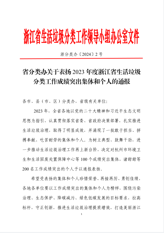 后勤服务中心荣获2023年度浙江省生活垃圾分类工作成绩突出集体