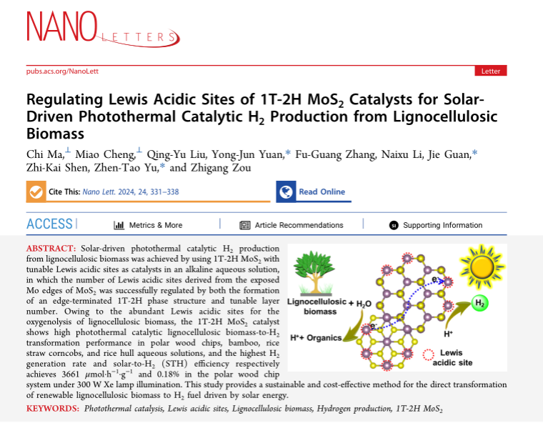 近日,我校材料与环境工程学院新能源材料研究中心元勇军教授团队与东南大学管杰教授、南京大学于振涛教授合作,在光热催化重整木质纤维素生物质制氢领域取得重要进展,相关成果以《Regulating Lewis Acidic Sites of 1T-2H MoS2 Catalysts for Solar-Driven Photothermal Catalytic H2 Production from Lignocellulosic Biomass》为题发表在国际纳米领域著名期刊Nano Letters (2024, 24, 331-338;IF:10.8,1区,TOP期刊)。材环学院2021级研究生马弛与东南大学化学学院博士研究生程淼为共同第一作者,我校元勇军教授与东南大学管杰教授、南京大学于振涛教授为共同通讯作者,杭州电子科技大学为第一通讯单位。