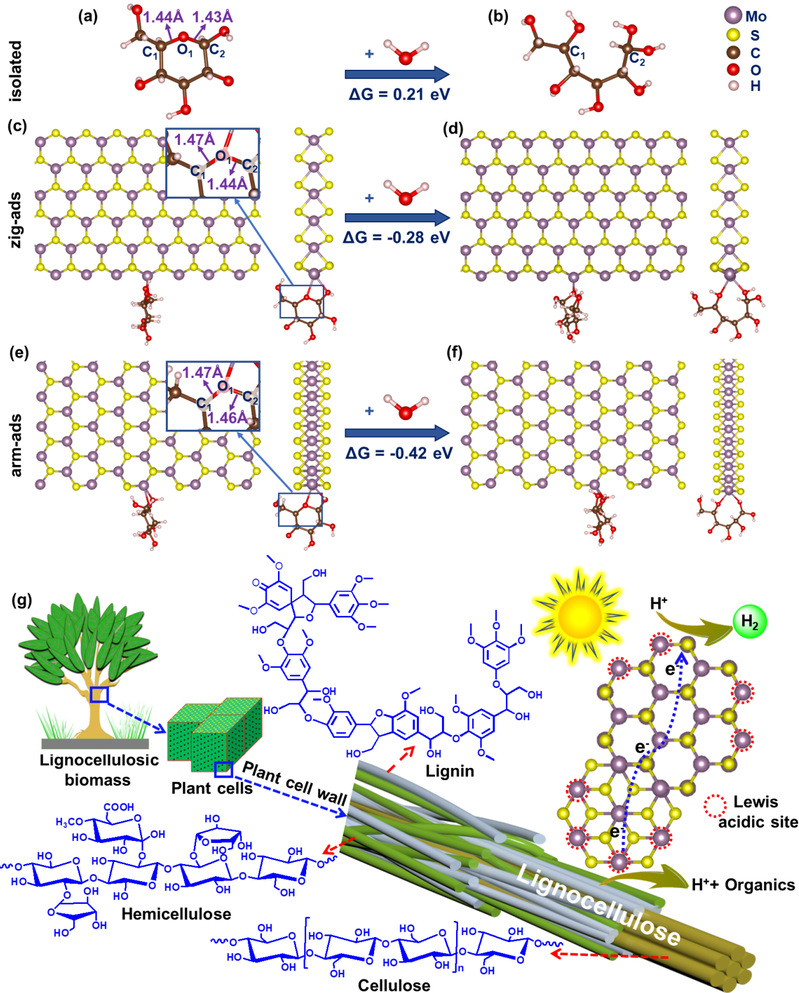图2. (a-f) DFT模拟MoS2催化剂化学吸附有机底物及其自由能变化; (g) MoS2催化剂光热催化重整木质纤维素生物质制氢可能的反应机理。
