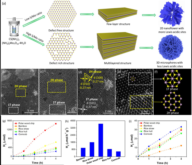 图1. (a) MoS2催化剂合成示意图;(b-f) MoS2催化剂球差HAADF-STEM 图,1T与2H相MoS2结构示意图; (g-i) MoS2催化剂光热催化重整木质纤维素生物质制氢性能曲线图。