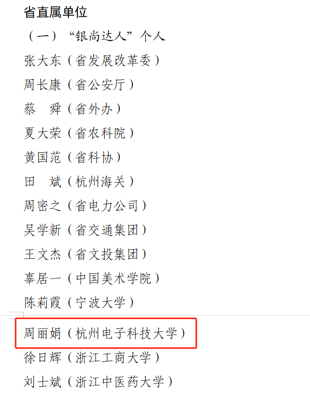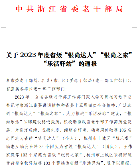 近日,省委老干部局公布了2023年度省级“银尚达人”“银尚之家”“乐活驿站”评选结果,我校退休教师周丽娟荣获省级“银尚达人”称号。