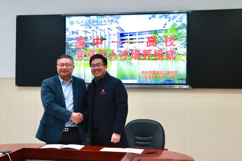 1月16日下午,李文钧副校长带队走访杭州市富阳区江南中学,与江南中学的校领导共同探讨高中高校贯通式人才培养模式、共建研学基地战略合作等事宜。江南中学校长周朝勇,副校长季丰、董建农、骆文俊,综合办主任毛艳龙,教师部主任黄斐,教学部副主任袁利国参加会议。我校电子信息学院院长何志伟,电子信息学院党委书记陈龙,电子信息学院副院长游彬,副院长赵文生,招生就业处副处长范文琪,集成电路学科负责人刘军教授、王骏超副教授参加座谈。