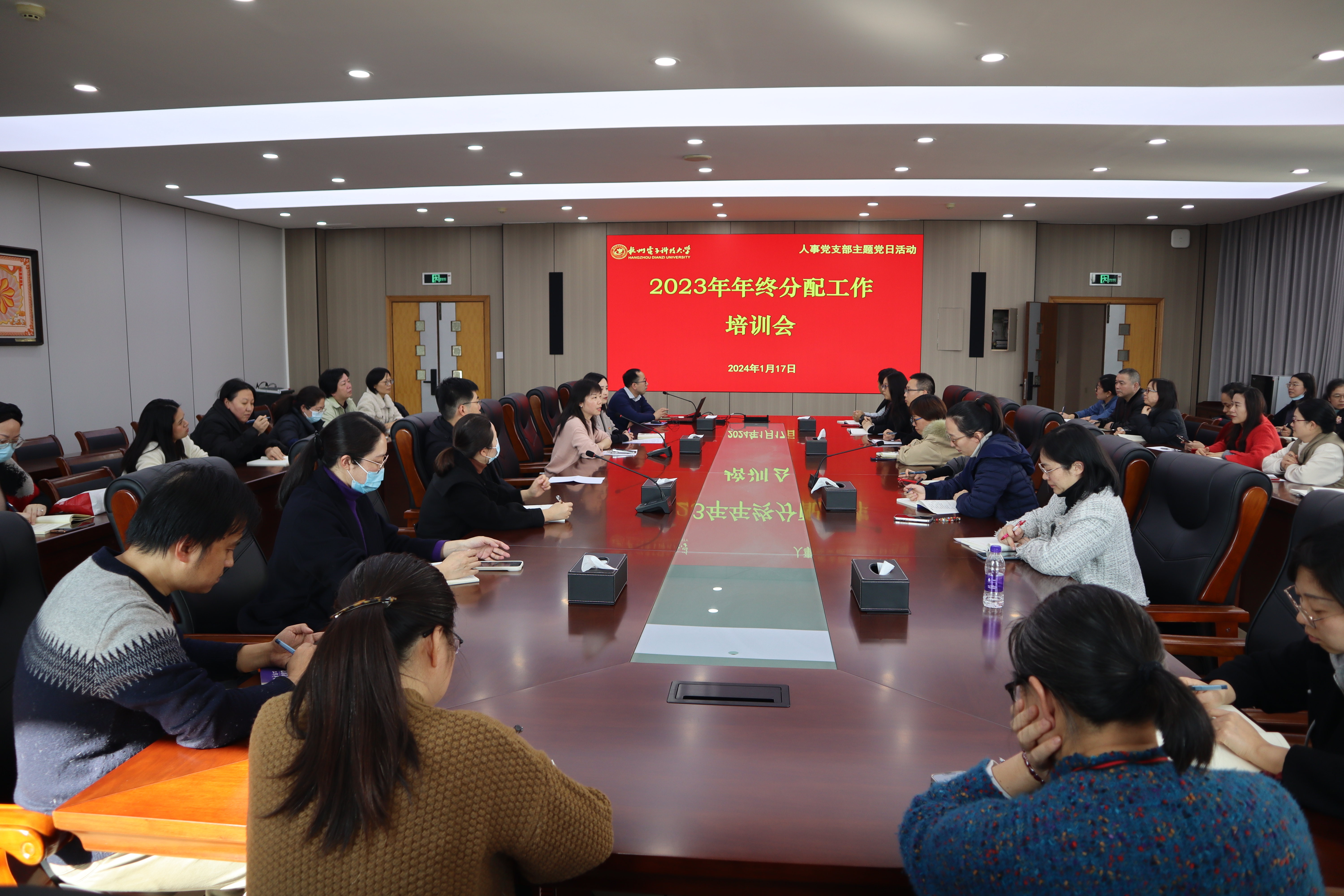 为深化和巩固学习贯彻习近平新时代中国特色社会主义思想主题教育成果成效,把学习成果转化为干事创业的实际行动,1月17日下午,人事处党支部在行政楼三楼会议室开展“精准聚焦需求,高效服务人才”主题党日活动,主要围绕2023年年终分配操作工作进行培训,各学院、部处人事秘书参加活动。活动由人事党支部书记严莹主持。