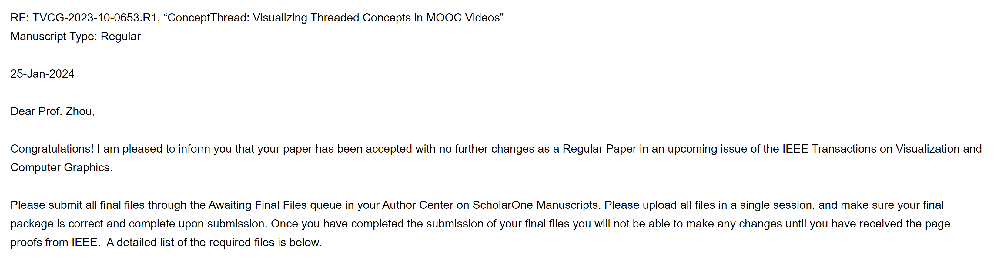TVCG英文全称IEEE Transactions on Visualization and Computer Graphics,是 IEEE计算机协会主办的顶级期刊,主要收录计算机图形学、信息与科学可视化、系统、软件、硬件、用户交互、虚拟/增强现实等领域的优秀研究成果。目前TVCG是中国计算机学会(CCF)推荐A类国际学术期刊,是计算机图形学与多媒体方向三大A类期刊之一,另外两个分别是ACM Transactions on Graphics(TOG),IEEE Transactions on Image Processing(TIP)。同时,TVCG也是中国科学院SCI一区和TOP期刊,最新影响因子5.2。该文章的录用表明我校的科研水平、青年教师和研究生培养在高水平大学建设战略背景下得到显著的提升。