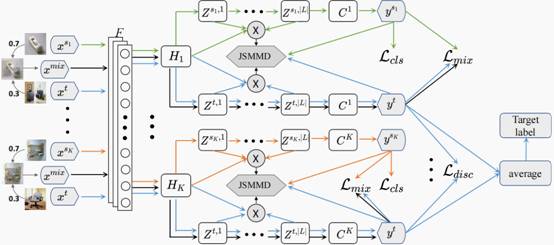 多源无监督领域自适应(MUDA)旨在最小化多个标注完备的源域和目标域之间的域偏移,从而将多个源域学到的知识转移到无标签的目标域。最近关于MUDA的研究主要集中在将每对源域和目标域在不同特征空间进行分布对齐,以减少它们之间的域偏移。然而,这些方法存在两个主要缺点。首先,它们通常关注全局域偏移,缺乏对类别对应子域的联合分布差异的考虑。其次,远离样本中心的分布外“难”样本难以通过全局域对齐来拉近。因此,我们提出了一种新颖的用于MUDA的深度联合语义自适应网络(DJSAN)。具体而言,我们首先提出了一种新颖的基于最大均值差异(MMD)的度量方法,即联合语义最大均值差异(JSMMD),它可以统一优化多个任务特定层上的类别对应子域的跨域联合分布差异。此外,为了处理分布外的“难”样本,我们提出了一种跨域数据增强方法,称为源域目标域混合(STDMix),以增强模型的鲁棒性,该方法将源域和目标域按固定比例合成一个新域,并利用信息熵为目标域中的样本提供可靠的伪标签。在三个公共数据集(Office-31、Digits-five和Office-Home)上的实验结果表明,我们提出的方法分别在平均准确率上获得了0.3%、1.8%和2.7%的提升。