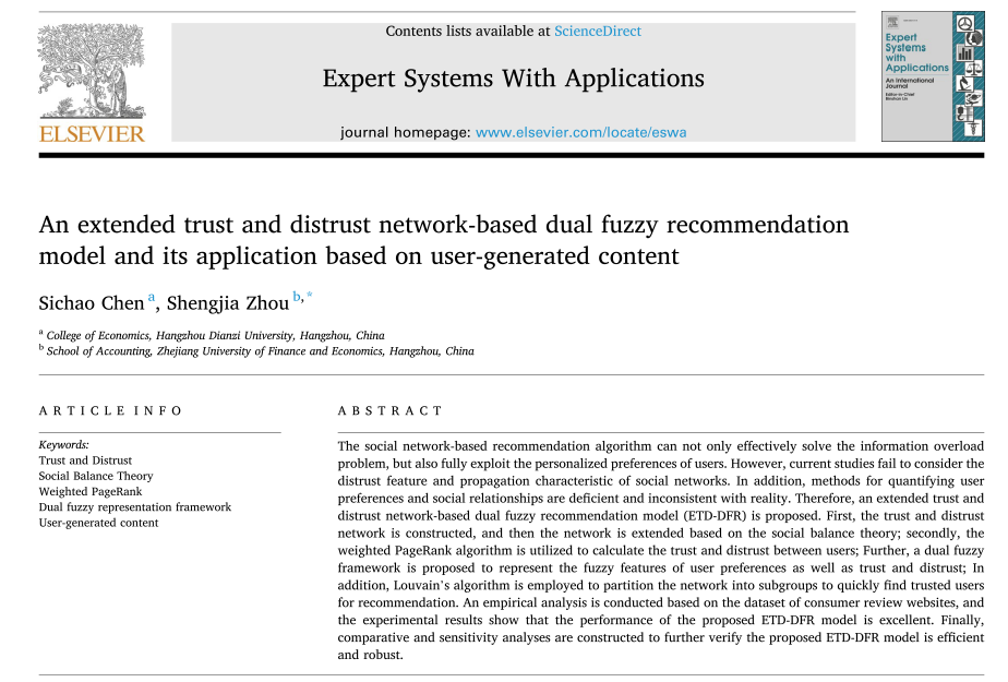 近日,我校经济学院陈思超博士以第一作者身份在SCI期刊Expert Systems with Applications上发表论文“An extended trust and distrust network-based dual fuzzy recommendation model and its application based on user-generated content”,该期刊是中国科学院SCI一区Top类期刊,影响因子为8.49。