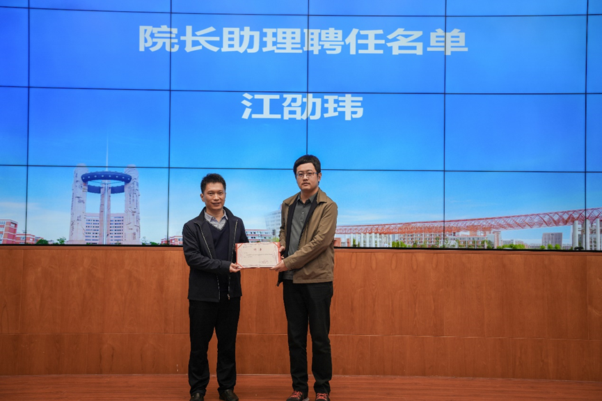 最后,学院举行了院长助理聘任仪式,颜校长为江邵伟老师颁发聘书。他鼓励青年教师们要有干劲、闯劲、韧劲,将个人发展紧密融入到学院、学校发展的总体布局中去,靠实招展示能力、靠实干成就事业、靠实绩赢得发展。