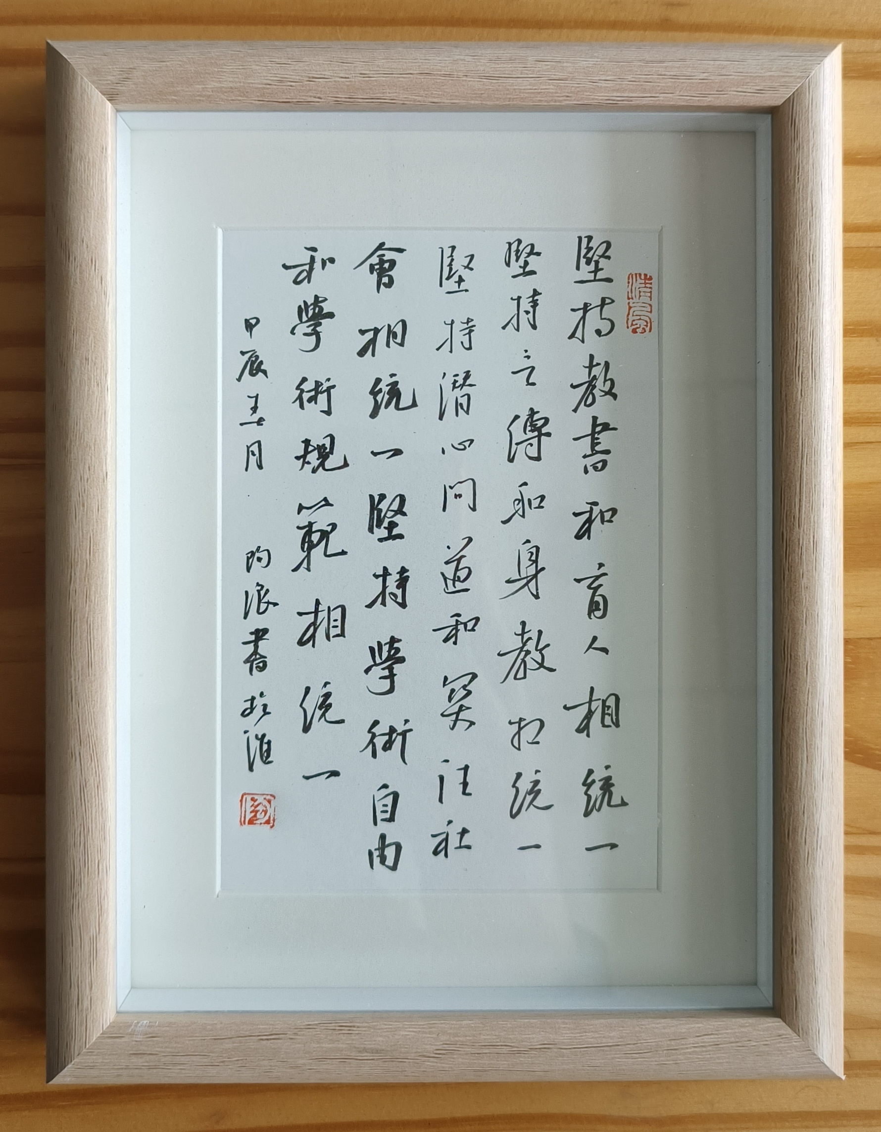 颁发给每一位新入职教师的师德师风座右铭牌,是理学院书法家用毛笔手书习近平总书记对高校教师提出的“四有”“四个引路人”“四个相统一”的要求。同时颁发的还有对新教师提出师德师风要求的入职纪念证书。学院通过入职仪式,引导新教师忠诚党的教育事业,遵守教育法律法规,时刻铭记教书育人神圣使命,心有大我,潜心治学,立德修身,培根铸魂,引领学生健康成长,做到有理想信念、有道德情操、有扎实学识、有仁爱之心,立足岗位创先争优,争做教书育人模范,为实现中华民族伟大复兴贡献力量。