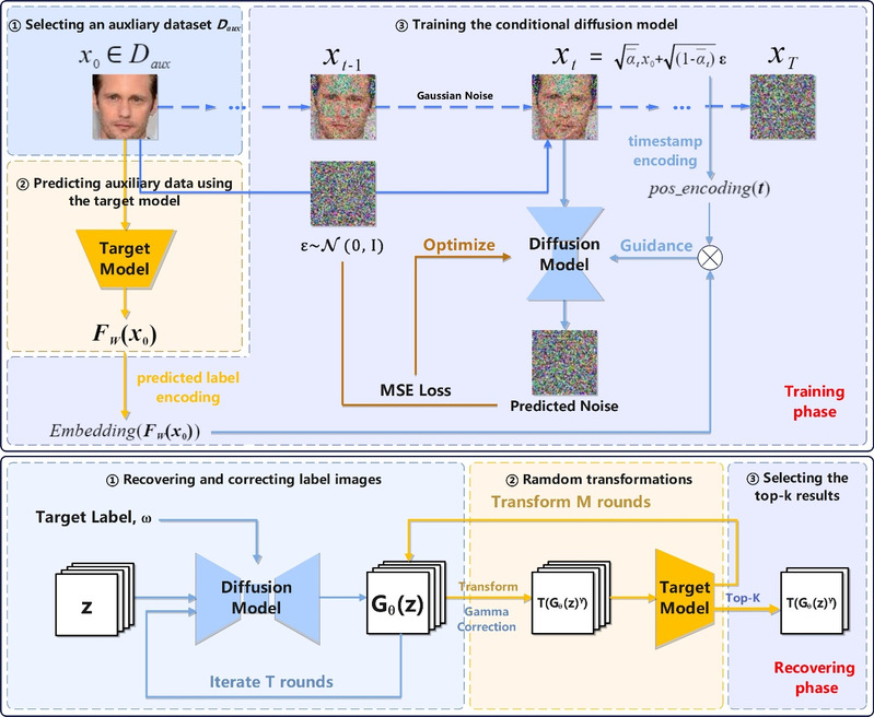 论文中提出基于条件扩散模型开发了一种仅标签模型逆向攻击方法,在敌手仅能通过访问模型获取预测标签的前提下,仍能够恢复训练集中特定目标的代表性数据。突破了现有黑盒、仅标签方法存在攻击模型未有效利用目标模型知识训练、攻击模型针对目标类只能获取唯一的生成结果,攻击会因扰动保护后的预测置信度影响等的技术问题。