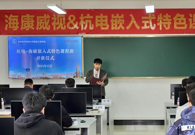 3月27日,杭州电子科技大学通信工程学院与海康威视的嵌入式特色课程班开班仪式正式举行。海康威视前端产品业务部总经理朱晓鸣,嵌入式专家叶子、徐永宏、陈鑫、申留军,高级招聘经理郭星甫,招聘经理张曼、朱家林出席本次仪式。通信工程学院党委书记何宏,党委副书记、纪委书记陈新峰,副院长应娜,实验室副主任冯维,教师朱芳参加开班仪式。本次仪式由通信工程学院辅导员王海宝主持。