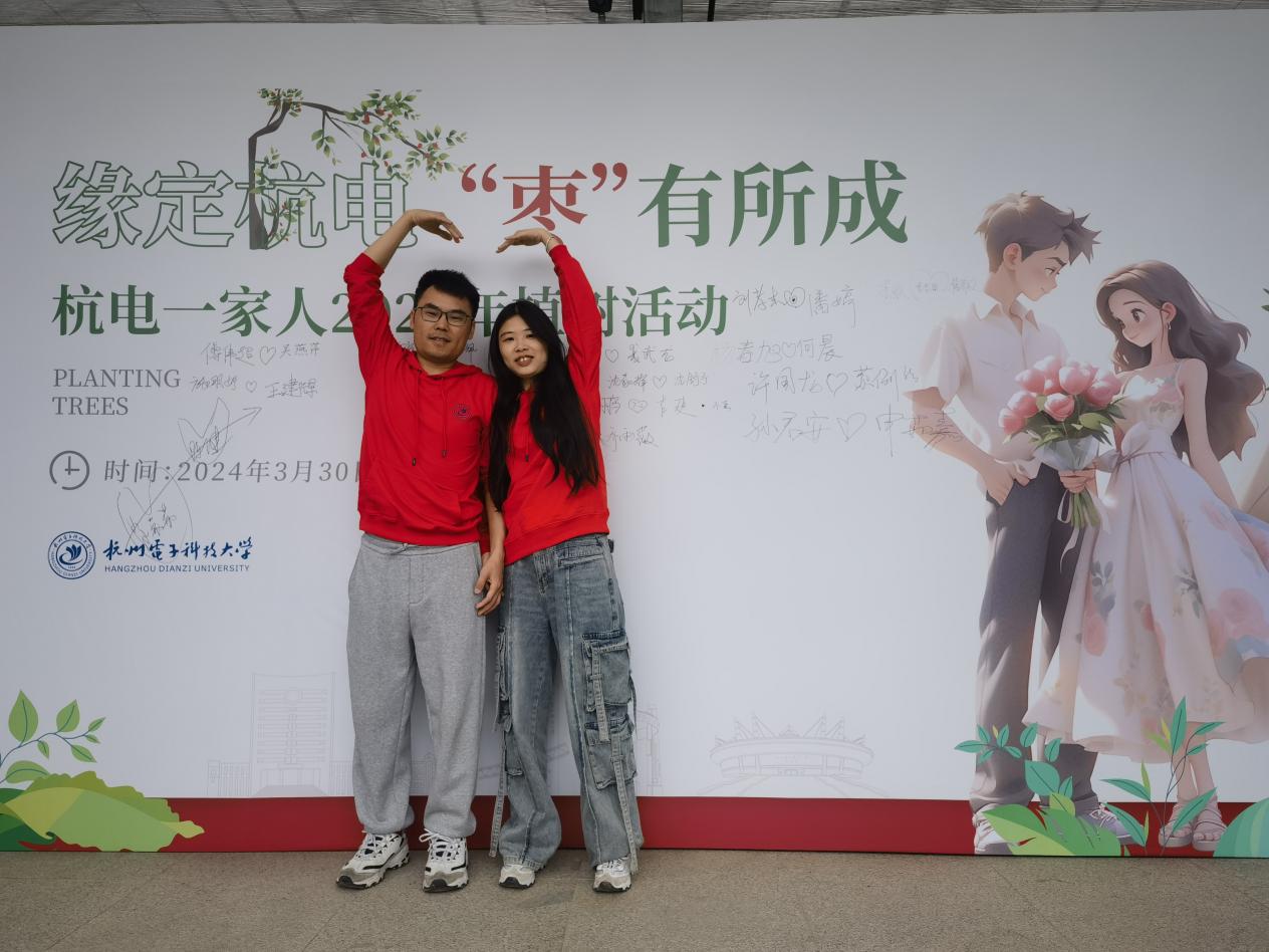 枣树,寓意着丰收、喜庆与和谐,代表着夫妻、情侣之间相濡以沫、携手并进的美好愿景。正值万物复苏的植树好时节,3月30日,杭电下沙校区休读园内,首届“缘定杭电 枣有所成”校友植树认养活动正如火如荼地进行。16对身着红色情侣装的校友夫妻、情侣,从四面八方返回母校,幸福的笑靥如春日美景、夏日晴空,治愈而温馨。