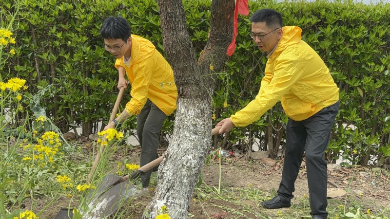 在工作人员的统一组织、安排下,参加活动的领导同校友、同学们一起投入到植树劳动中,大家相互配合,铲土造坑、培土围堰、踩土固苗、提水浇灌,最后将承载满满祝福的无废风铃挂在枣树上,现场气氛热烈,仪式满满。校学生会的同学们表示——“植一抹绿色,添一片春光”,植树活动意义非凡。