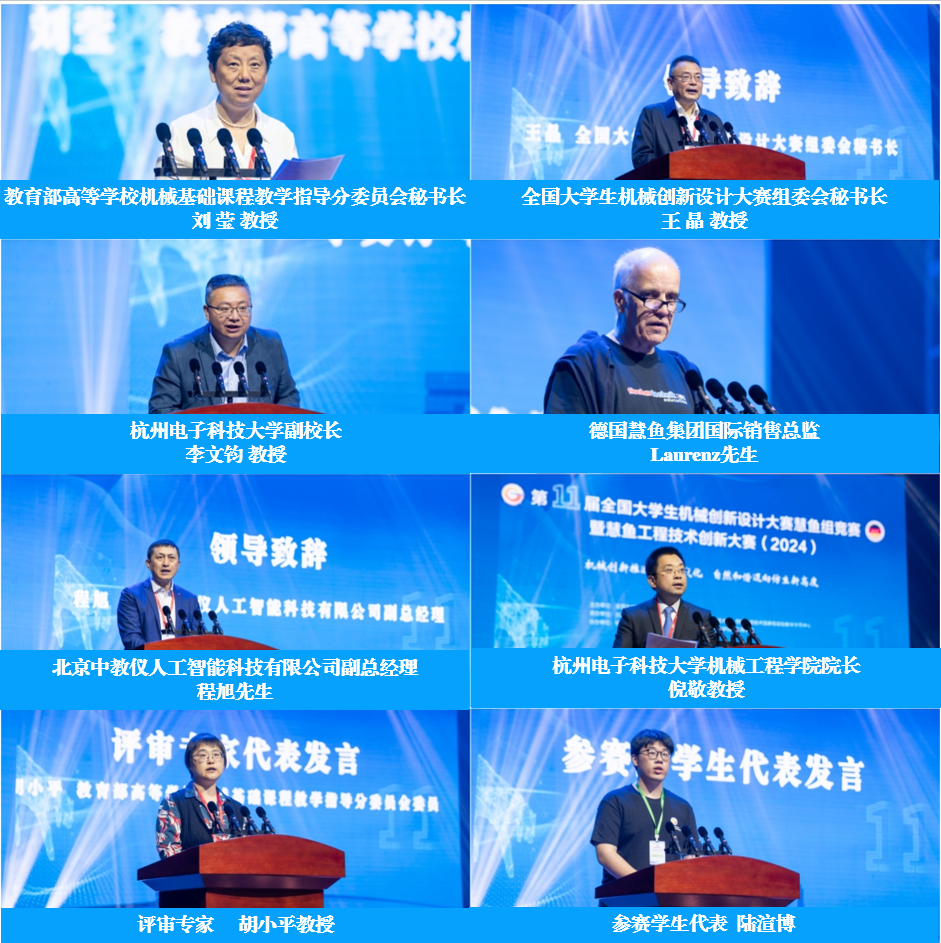 4月20日,开幕式在炫酷的激光秀中拉开帷幕。教育部高等学校机械基础课程教学指导分委员会秘书长刘莹教授、全国大学生机械创新设计大赛组委会秘书长王晶教授、杭州电子科技大学副校长李文钧教授、德国慧鱼集团国际销售总监Laurenz先生和北京中教仪人工智能科技有限公司副总经理程旭先生分别作精彩致辞。杭州电子科技大学胡小平教授代表评审专家做评审承诺。参赛学生代表陆渲博代表所有参赛学生做了发言。大赛开幕式由杭州电子科技大学机械工程学院院长倪敬教授主持。