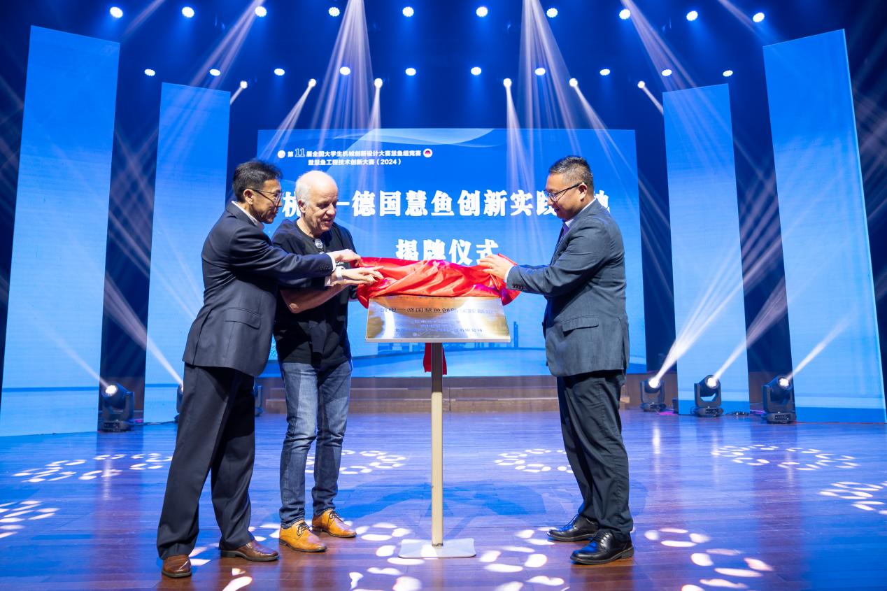 开幕式上举行了杭电—德国慧鱼创新实践基地揭牌仪式。杭州电子科技大学副校长李文钧、德国慧鱼集团国际销售总监Laurenz先生和北京中教仪人工智能科技有限公司总经理单永波先生上台揭牌。