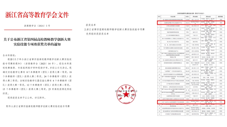 近日,由浙江省教育厅指导、省高等教育学会主办的浙江省第四届高校教师教学创新大赛实验技能专项赛在浙江师范大学圆满落幕。今年是我省第二次举办实验技能专项赛,共吸引全省57所高校400多个作品报名参赛,44所院校的81个作品入围现场决赛。我校推选的自动化学院刘光宇教授团队和通信工程学院姜斌教师团队作品荣获自制实验教学仪器设备比赛一等奖和三等奖,在第一次省实验技能专项赛获一等奖后再获殊荣。同时学校也荣获优秀组织奖。