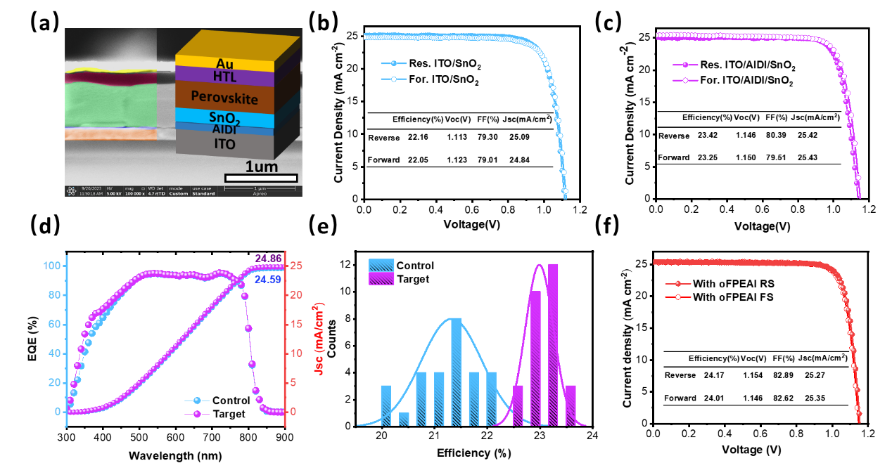 在第二个工作中,研究者合成了1-(3-氨基丙基)-咪唑二碘酸盐(AIDI), 并将其作为氧化铟锡(ITO)/SnO2界面的预处理添加剂。为改善埋藏界面来提高钙钛矿太阳能电池的整体性能提供了一种新的方法。博士生杨高元为论文第一作者,杭州电子科技大学周勤特聘副教授、严文生教授和中国科学院福建物质结构所高鹏研究员为论文通讯作者。