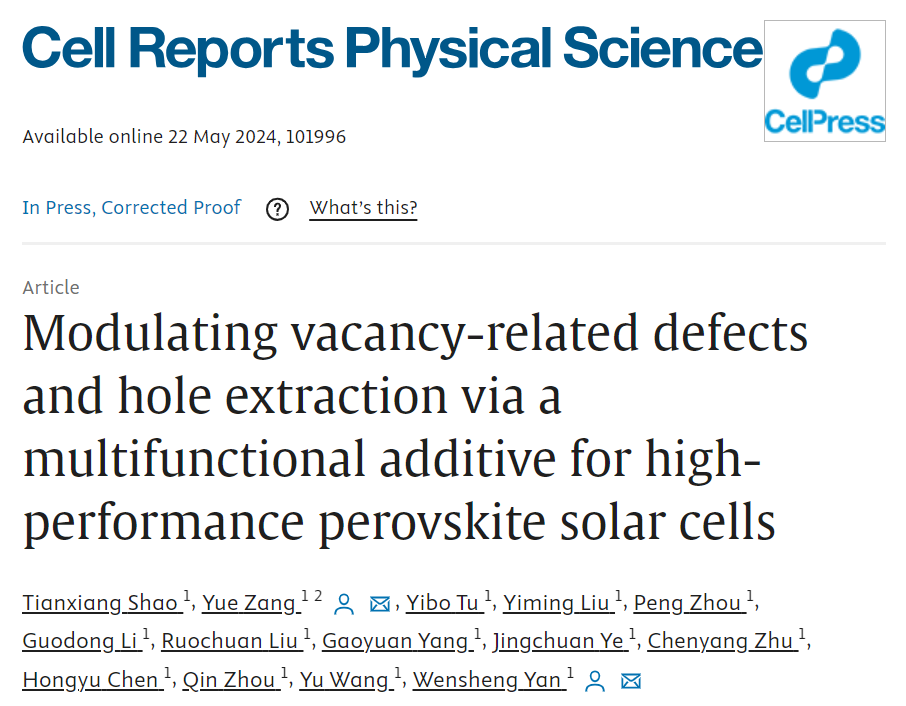 我校碳中和能源电子团队两名研究生杨高元和邵天翔分别在Cell子刊发表一作钙钛矿电池研究论文