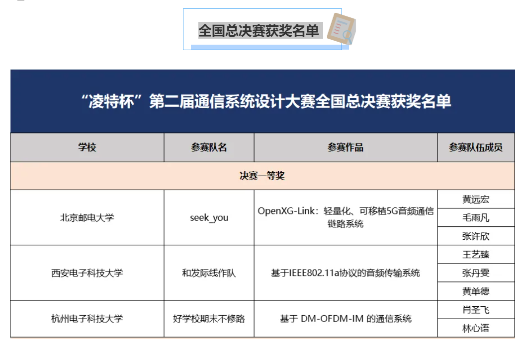 决赛现场,123支队伍激烈角逐,争夺全国总决赛的荣誉。最终,北京邮电大学的“seek_you”团队、西安电子科技大学的“和发际线作队”以及杭州电子科技大学的“好学校期末不修路”团队荣获了一等奖。中国人民解放军国防科技大学的“畅通无阻”、北京交通大学的“HWZ”,中国人民解放军海军工程大学的“彭李林”等5个团队荣获二等奖。华中科技大学的“汪汪队”、西安交通大学的“OP放大器”、东南大学的“创信者”等20个团队荣获了三等奖。