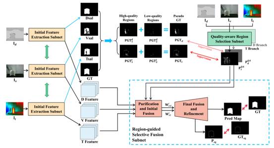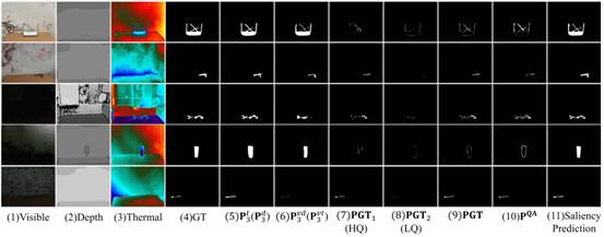 显著目标检测(SOD)的目的是找到和分割图像中最引人注目的区域,其作为计算机视觉中的一项基本且关键的任务,已广泛应用于许多计算机视觉任务中。然而,现有的三模态SOD方法无法感知深度图像和热红外图像的质量,这导致了在处理质量不佳的深度和热红外图像的场景时的检测性能显著下降。基于上述问题,该研究提出了一种质量感知选择性融合网络(QSF-Net)来进行Visible-Depth-Thermal(VDT)显著目标检测任务。该网络由三个子网络构成:初始特征提取子网络、质量感知区域选择子网络和区域引导选择性融合子网络。首先,初始特征提取子网络不仅负责提取特征,还通过收缩金字塔结构(MSF)模块生成初步预测图。接着,我们设计了弱监督的质量感知区域选择子网络,用以生成质量感知驱动的预测图。具体来说,我们首先利用多模态的初步预测图识别深度模态和热红外模态中的高质量和低质量的区域,再根据上述区域进一步生成伪标签,以供训练该子网络。最后,区域引导选择性融合子网络在质量感知预测图的指导下对初始特征进行净化,并通过模态内和模态间注意力(IIA)模块及边缘细化(ER)模块,分别融合三模态特征以及细化预测图的边缘细节。通过在三模态SOD数据集上的广泛实验,表明本研究所提出的QSF-Net模型在与现有方法的比较中,保持着较为显著的性能优势。