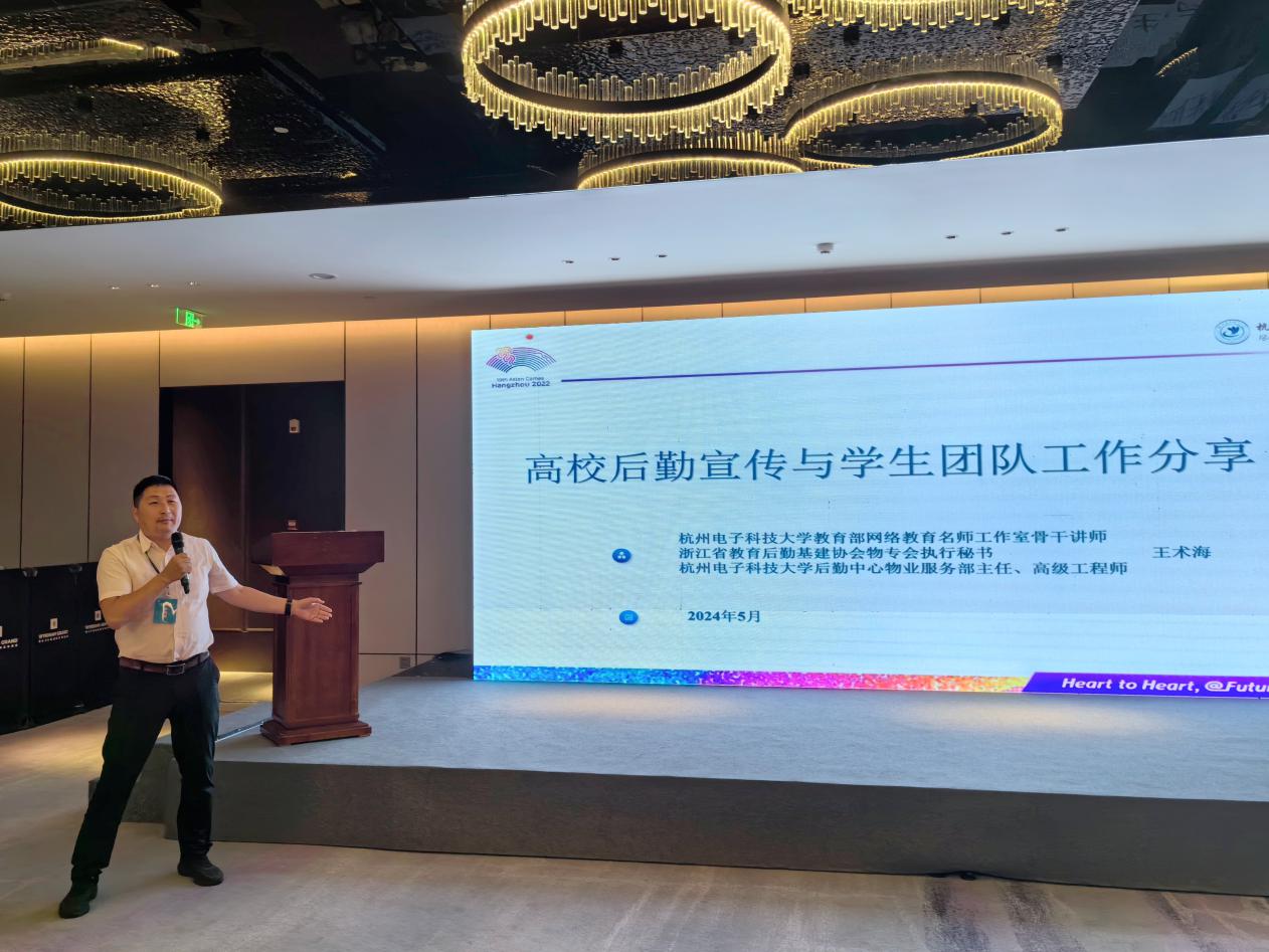 在分享交流环节,后勤服务中心物业服务部主任王术海代表学校作题为《高校后勤宣传与学生团队工作案例》的专题分享,就如何做好高校后勤信息宣传工作和如何建设管理学生团队的进行了交流发言。