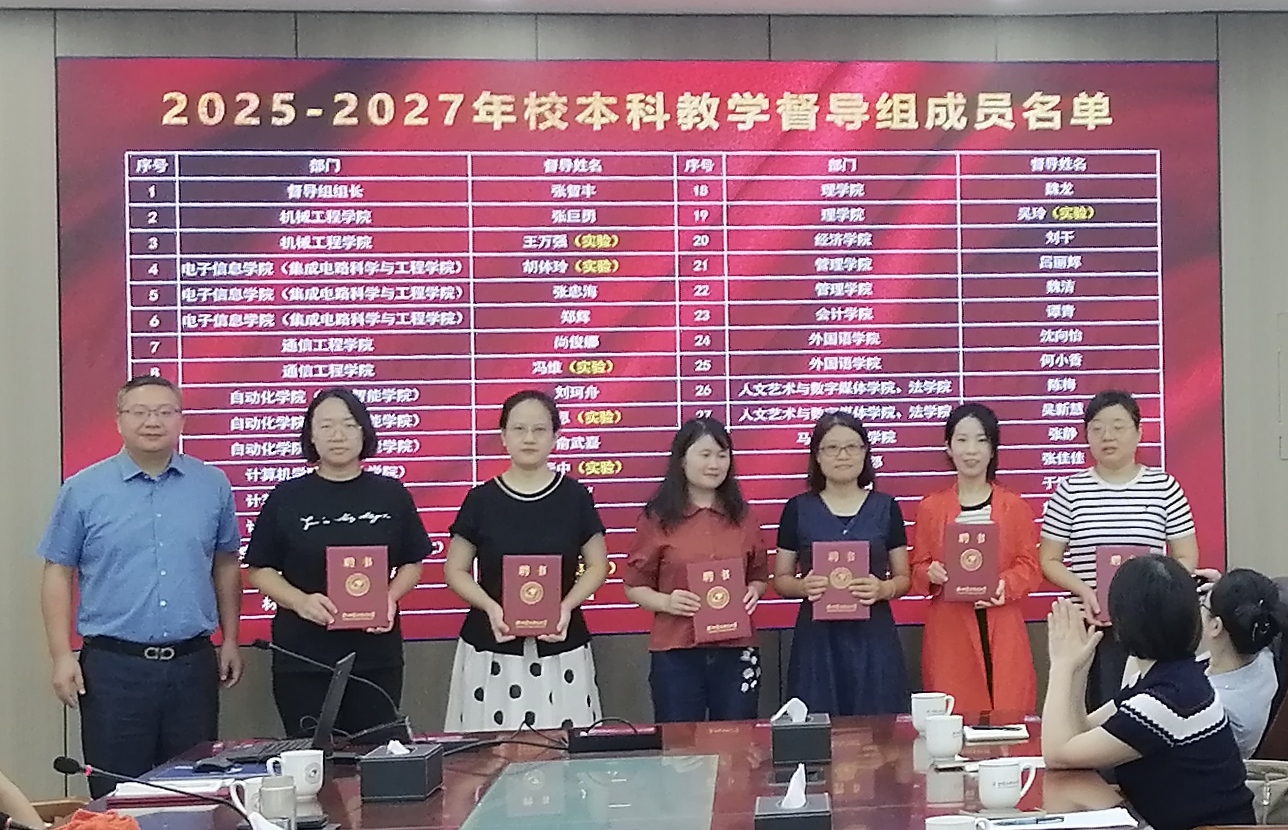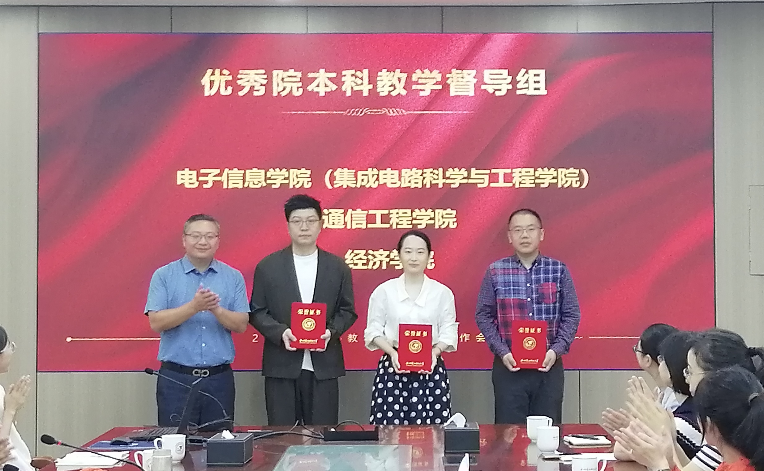 会议表彰了2023-2025年聘期荣获优秀教学督导奖的教师与集体,宣读了2025-2027年新一届校本科教学督导组成员名单,李文钧为获奖代表与督导组成员代表颁发了获奖证书与聘书。10位教师荣获“优秀校本科教学督导”荣誉,30位教师荣获“优秀院本科教学督导”,电子信息学院、通信工程学院和经济学院督导组获评“优秀院本科教学督导组”。