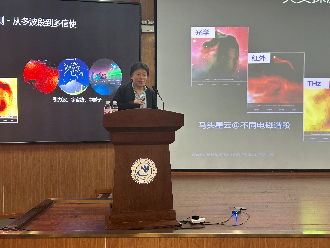 讲座中,史生才院士以“人类通过‘电波之眼’观测宇宙”为切入点,深入浅出梳理了射电天文学的发展脉络——从早期射电望远镜的诞生,到我国“天眼”FAST在星系探测中的突破性成果,生动展现了射电技术如何帮助人类突破光学观测局限,揭开宇宙深处的神秘面纱。针对师生关注的“技术与科学的协同创新”,院士重点解析了射电信号接收、数据处理中的核心难题,结合自身研发经历,强调“基础研究需扎根技术突破,技术创新瞄准科学问题”,尤其提到电子信息领域的毫米波器件、高精度信号处理技术,正是推动射电天文观测能力升级的关键支撑,与我校电子信息学科方向高度契合。