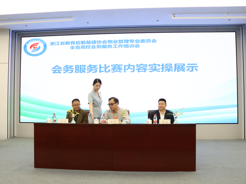 培训会还正式发布了第八届浙江省高校后勤物业服务人员技能比武大赛会务服务项目内容和题库,为下半年即将举办的大赛做好了赛前准备,引导各高校参训人员以赛促学、以赛促练。在培训会现场,我校国际交流中心柴艺老师应邀进行了会务服务实操项目的示范展示。柴艺以其规范精准的动作、从容优雅的仪态和一丝不苟的细节处理,完美演绎了会议摆台、茶水服务、座椅调整等关键环节的标准流程。