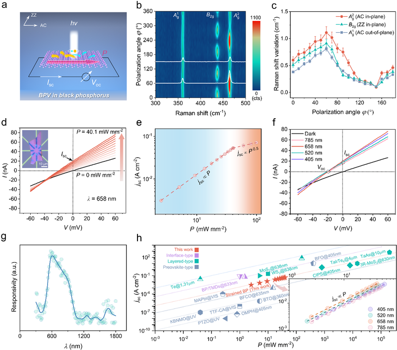 针对该问题,研究团队创新性提出各向异性热应变调控策略,通过精准诱导黑磷晶格在特定方向产生空间反演对称性破缺,首次在无复杂结型结构的条件下,成功在黑磷中实现了高效的体光伏效应。基于该技术构筑的新型光电器件,展现出超宽光谱响应(365–1800 nm)和高达52.2 mA cm-2的峰值光电流密度,器件在历经12000次循坏后性能无显著衰减,综合性能在国际同类型黑磷基光伏器件中位居前列。