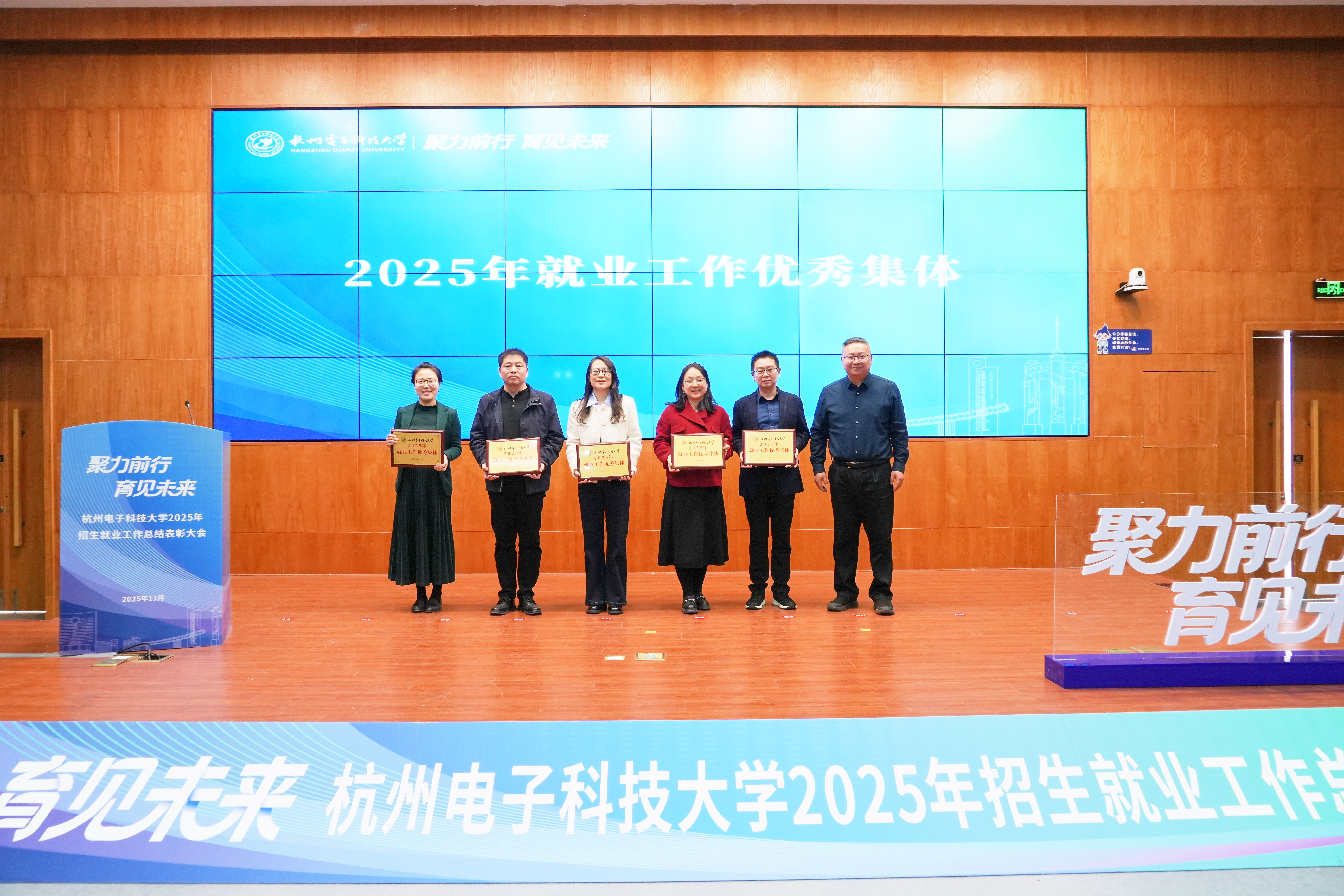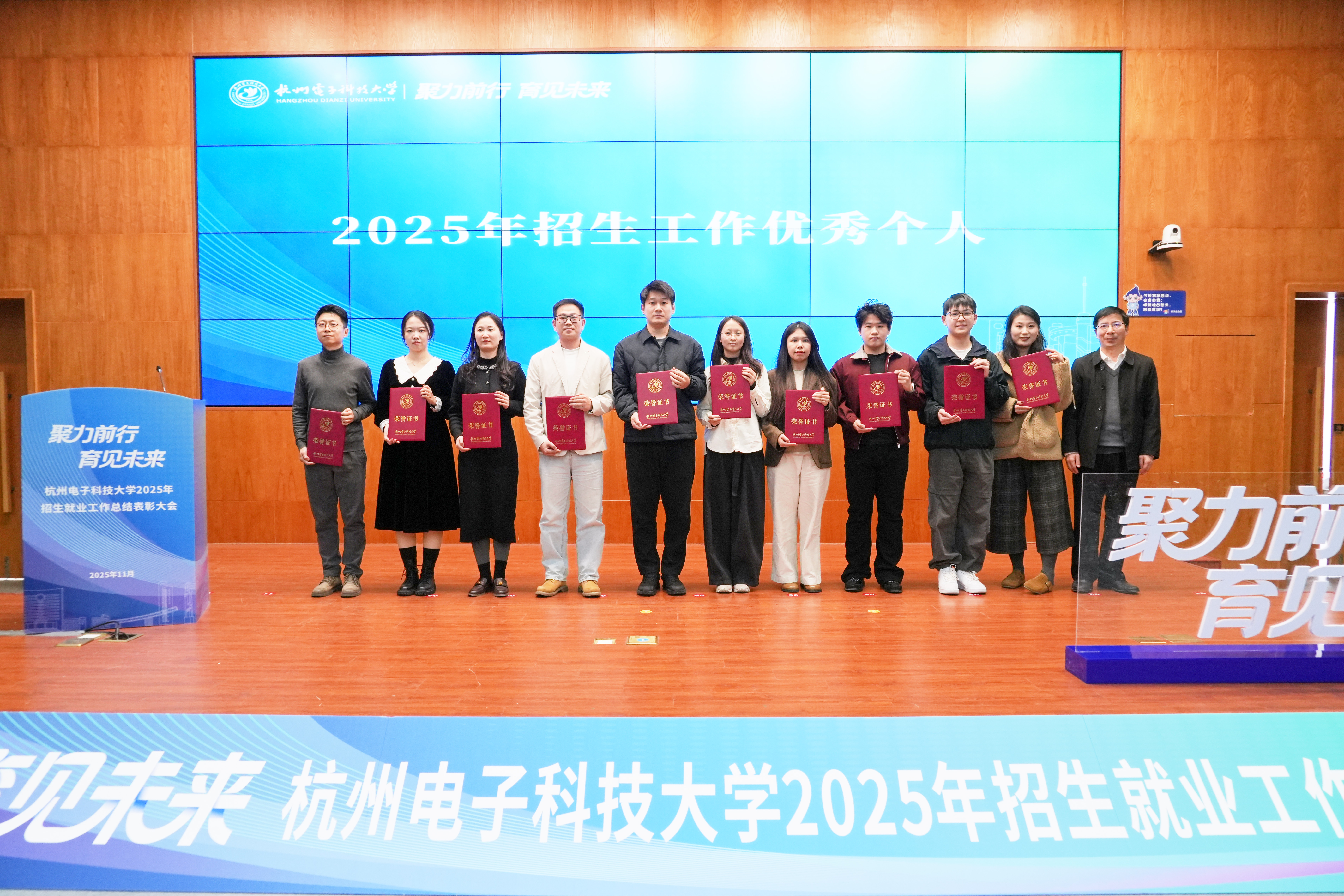 大会对招生就业工作先进集体与个人进行表彰。机械工程学院、电子信息学院、通信工程学院、自动化学院、计算机学院荣获“招生工作优秀集体”;电子信息学院、自动化学院、理学院、人文艺术与数字媒体学院、法学院、杭电圣光机联合学院获评“就业工作优秀集体”;马娇等60名师生获评招生和就业工作优秀个人。李文钧、戚明钧分别为获奖集体与获奖个人代表颁奖。