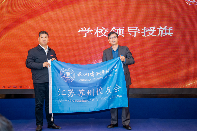 马国进宣布杭电苏州校友会成立并授会旗,大会为理事会成员颁发了聘书。会上,管晓斌校友创立的苏州LBED酒店被授予杭电苏州“校友之家”。