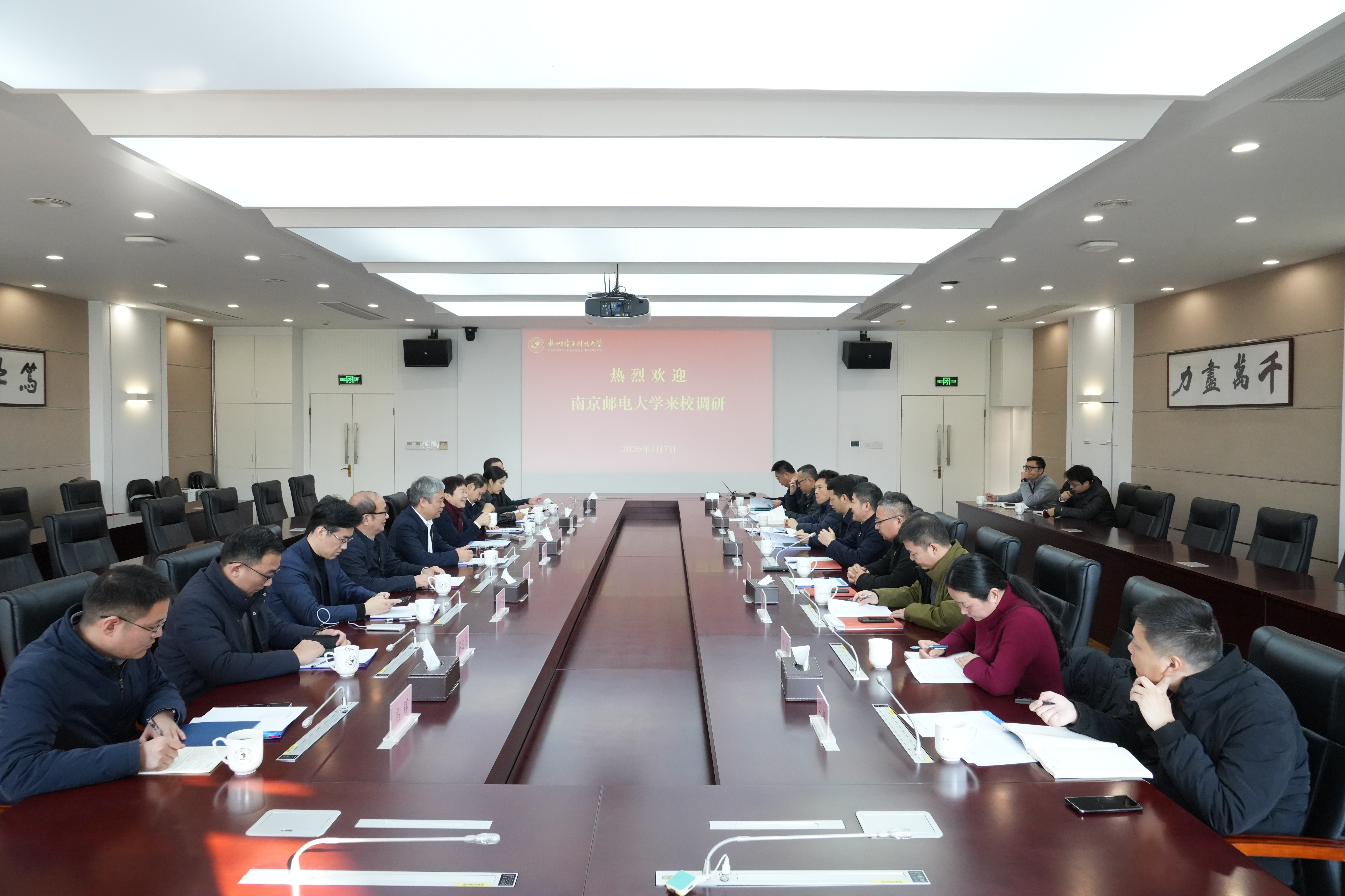 1月7日上午,南京邮电大学党委书记郭宇锋、校长叶美兰率队来我校调研交流,校党委书记王尧祥、校长陈积明热情接待来宾并举行座谈。双方围绕“十五五”规划编制、教育教学改革、有组织科研及科技成果转化等内容进行了深入交流。