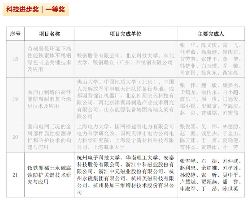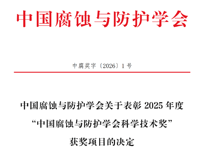 近日,中国腐蚀与防护学会(中国科学技术协会主管的国家一级学会)正式公布2025年度“中国腐蚀与防护学会科学技术奖”获奖项目。由材料与环境工程学院张雪峰教授团队牵头,联合华南理工大学、安泰科技、浙江中科磁业、浙江中元磁业、杭州永磁、杭州美磁和杭州易加三维增材技术有限公司,共同完成的“钕铁硼稀土永磁腐蚀防护关键技术研究与应用”项目荣获“科技进步奖”一等奖,杭州电子科技大学为第一完成单位。
