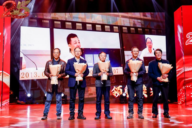 晚会特别融入公司成立25周年元素。领航荣光环节,到达现场的历任董事长受邀上台,接受员工代表的献花致谢和全场最崇高的敬意,感谢他们为公司发展打下的坚实基础。