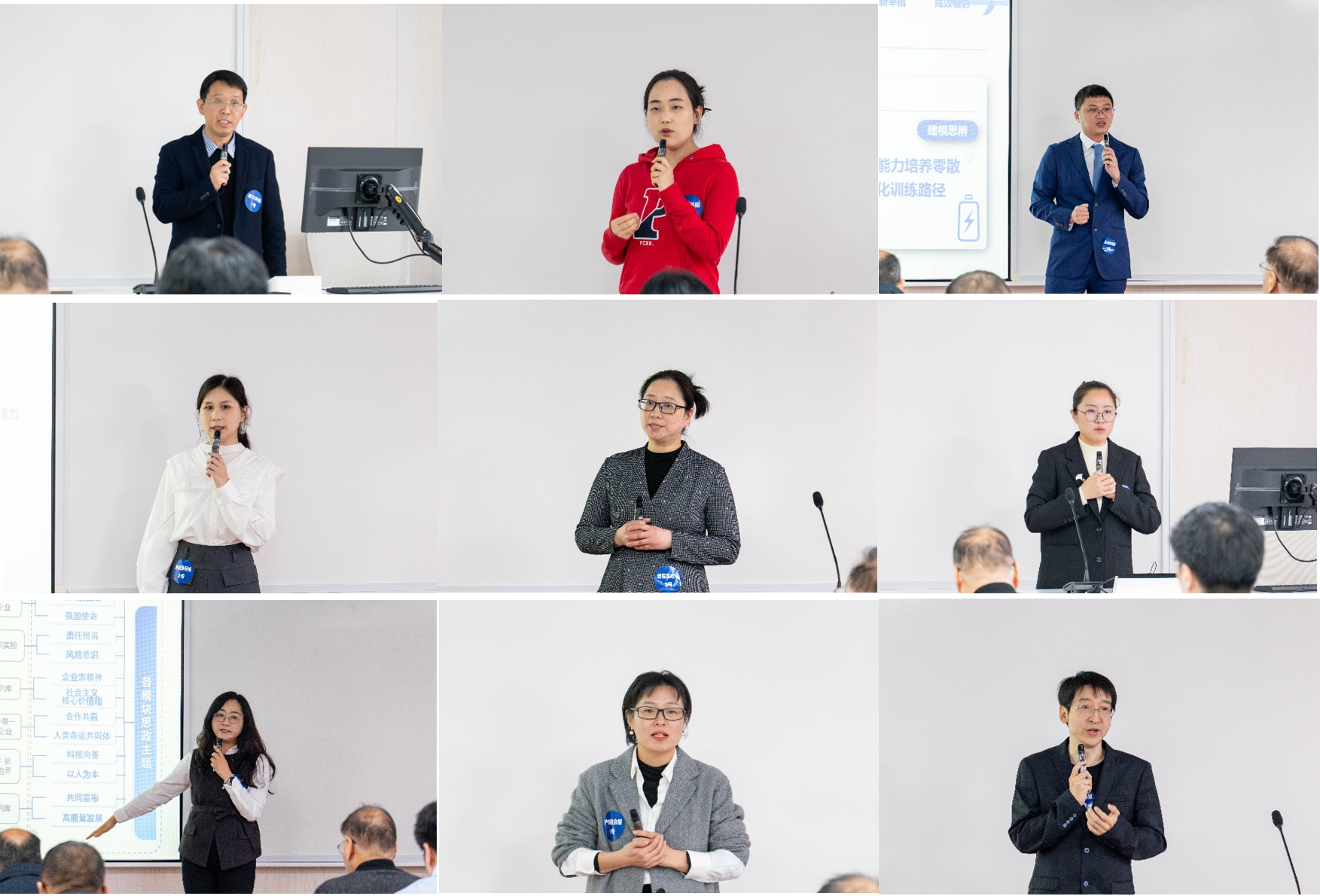 决赛现场,17位主讲教师分成两个赛场进行教学创新成果汇报展示。他们结合教学大纲,以AI时代下课堂教学实践的“真实问题”为切入点,从课程内容的重构、教学方法的创新、教学环境的创设、教学评价的改革、AI技术的深度融合等多方面进行了教学创新模式与方法的汇报,展现出我校教师在教学创新道路上紧跟时代需求、不畏艰难的勇气和丰硕的教学成果。