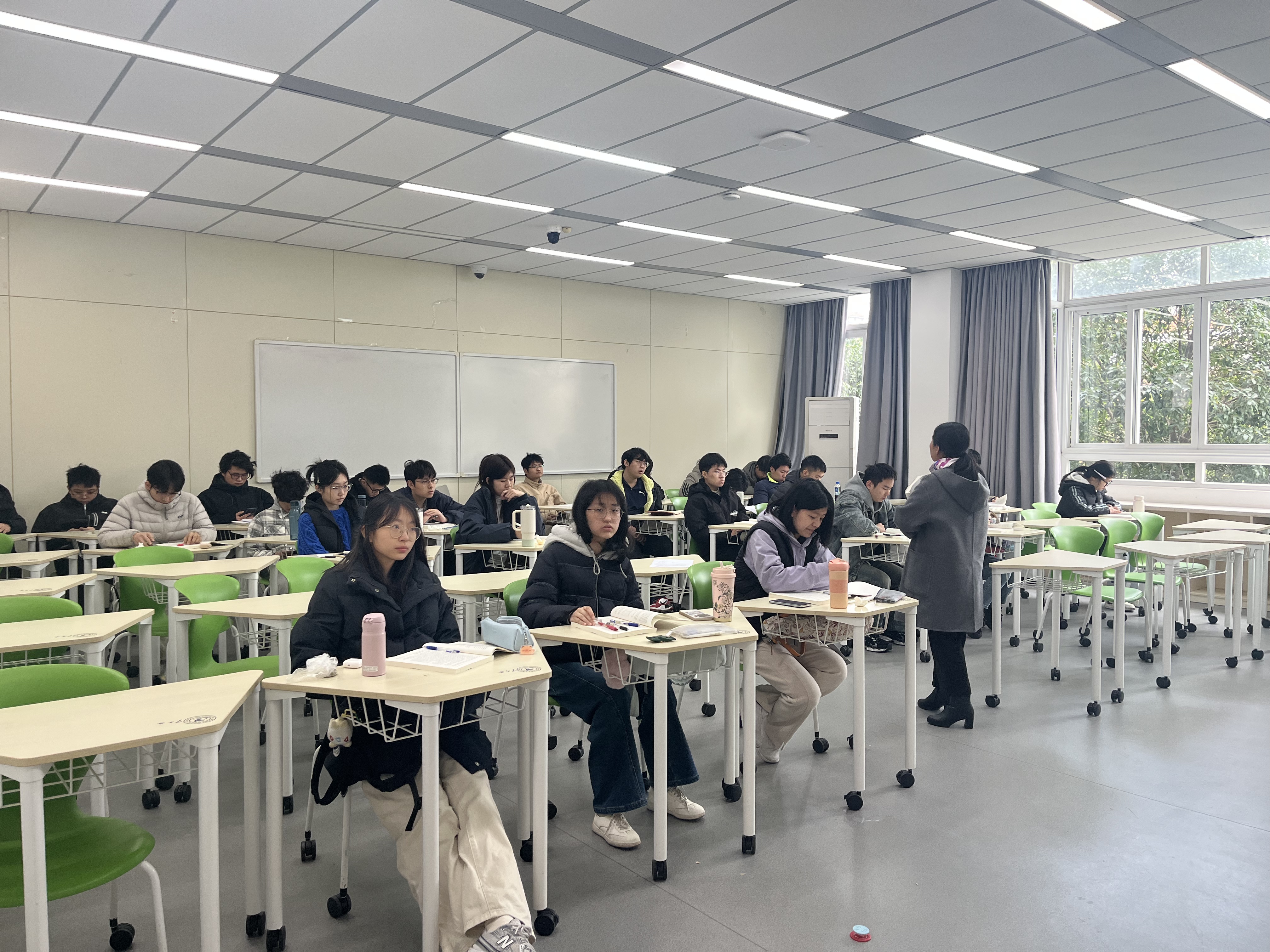 开学首日,全校有约372门课程、709个教学班正常开课。检查组重点对教师到岗、学生出勤、设备运行及课堂秩序等关键环节展开全方位检查。从检查整体情况看,新学期开课情况良好,教学秩序井然。各教学楼环境整洁,教学设备运转通畅,任课教师精神饱满、备课充分,展现出良好的教学状态;学生们出勤率和前排就座率高,听课专注投入,展现出新学期蓬勃向上的精神面貌。