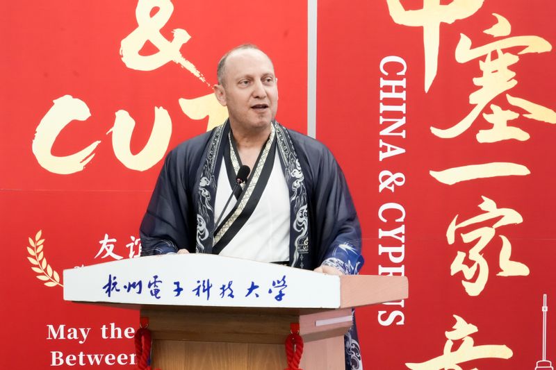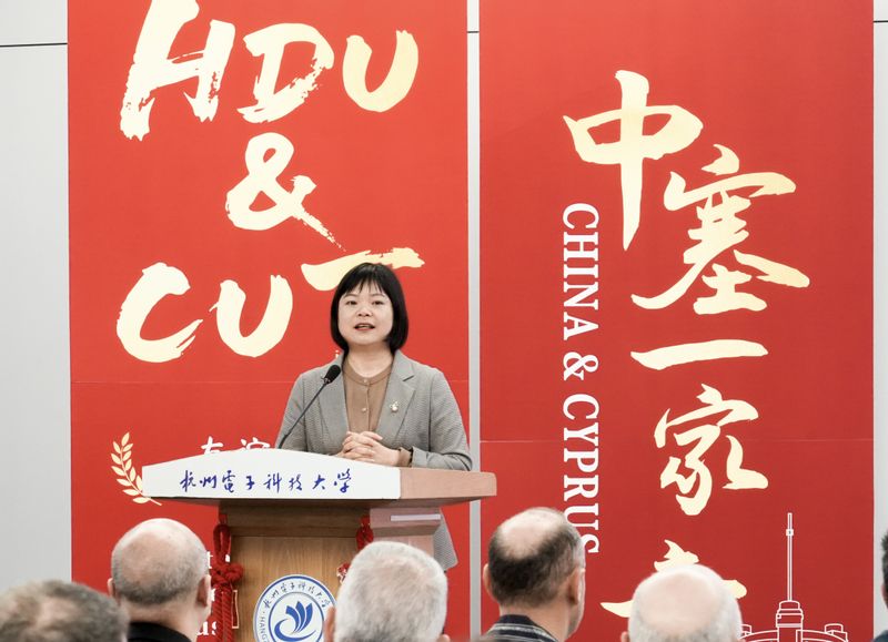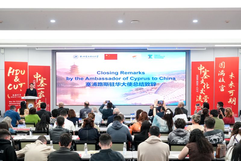 4月16日,2026中塞文化交流营结营仪式在杭州电子科技大学科技馆一楼会议室举行。塞浦路斯共和国驻中国大使库拉·索菲亚努(Koula Sophianou)、塞浦路斯理工大学校董会成员卢卡斯·赫里斯托杜利迪斯(Loukas Christodoulidis),杭电副校长李文钧及中塞师生代表70余人出席活动。